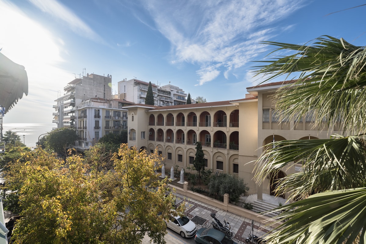 Unique 1 Bedroom fully equipped apartment on the seventh floor of a 2020 renovated building with a breathtaking terrace balcony. High speed internet, premium amenities, a luxurious queen size bed, and your very own Netflix account are but a few things we offer you. Luminous, spacious, with everything you might require to enjoy your stay in the heart of Thessaloniki's social life, only 5 minutes away from Aristotelous square and 2 minutes from the seafront. Welcome and enjoy your stay!