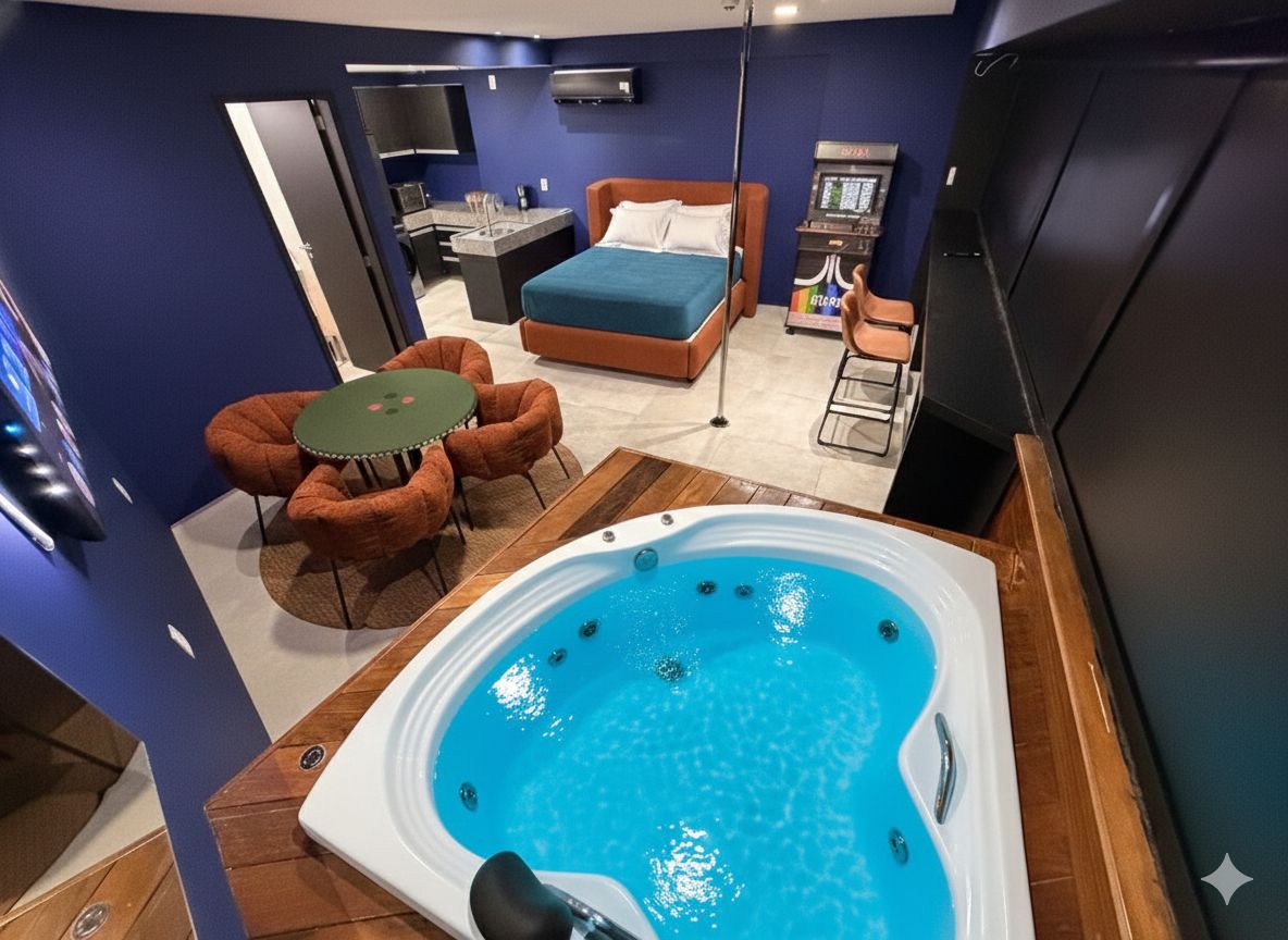Quarto temático inspirado em Las Vegas, com vista incrível do Paiva. Conta com pole dance giratório, banheira de hidromassagem, TV de 75”, mesa de poker e fliperama retrô. Possui cortinas automáticas e máquina de lava e seca. O prédio oferece rooftop com piscina de borda infinita, academia e restaurante com café da manhã. Experiência única. Let's PLAY
