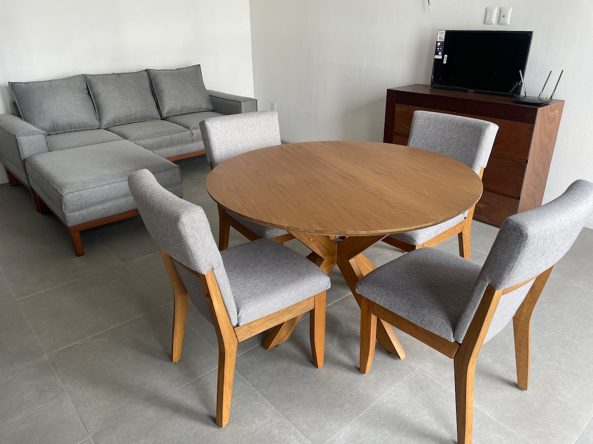 Apartmán-studio skvěle umístěný pár kroků od MidTown. Se všemi službami, 1 ložnicí, 1 kompletní koupelnou, plně vybavenou kuchyní, klimatizací, WiFi, garáží, terasou, prádelní místností, pro 1 nebo 2 osoby, Na jedné straně finanční čtvrti, velmi blízko Chapultepecu. Ideální pro služební cesty, krátké nebo dlouhé pobyty nebo prostě na tak dlouho, jak dlouho budete potřebovat, abyste navštívili město a měli bezpečné, příjemné a klidné místo k odpočinku... na tomto jedinečném a klidném místě.