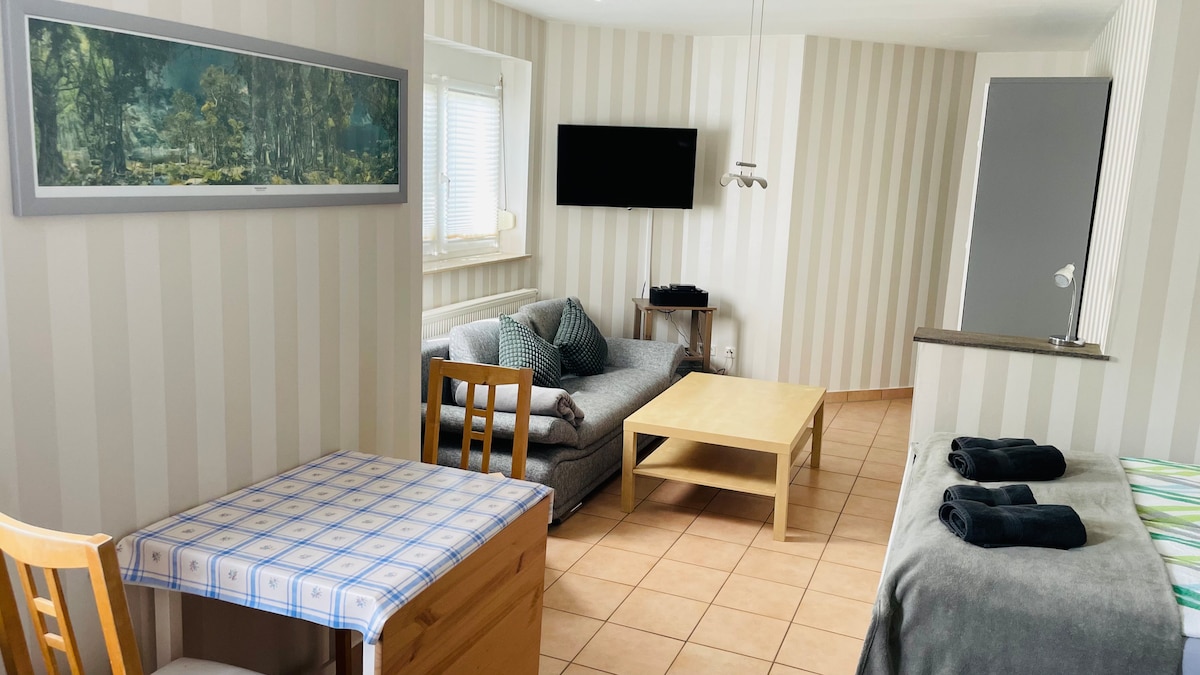 Tento apartmán se nachází v suterénu našeho domu. V bytě se nachází pohodlné skládací lůžko (200 cm x 160 cm), dvě křesla se stolem, lampa na čtení, moderní a plně vybavený kuchyňský kout, moderní barový stůl s pohodlnými barovými židlemi pro dokonalý výhled na Jenzig, moderní a velmi komfortně vybavená koupelna/WC. V případě potřeby je možné u nás nabít vaše elektromobil. V tomto ohledu nás prosím kontaktujte PŘED vaším příjezdem!