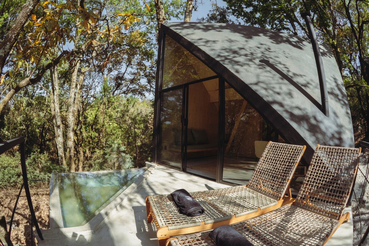 Pasa unos días de ensueño en esta cabaña moderna con alberca en medio del bosque de Tepoztlán, con alberca privada y red de descanso, rodeada de árboles, ardillas y nubes al despertar. A 5 min del centro de Tepoztlán, ideal para salir a caminar o en bicicleta y conectar con la naturaleza. Diseñada por una firma especializada en alojamientos únicos y originales, descúbrela junto con tu familia o amigos, se encuentra en un fraccionamiento cerrado.