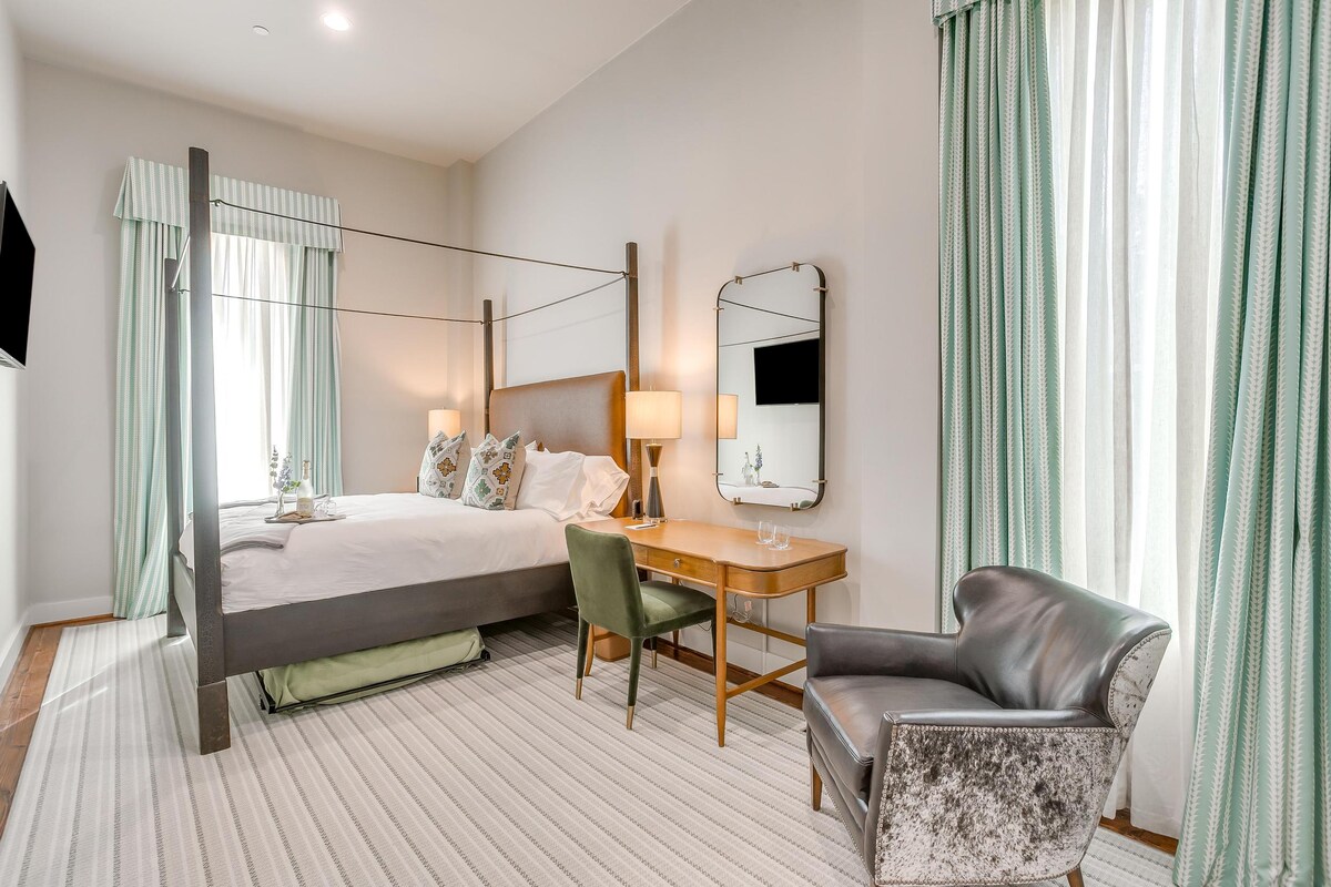 Step into the charm of the Historic Nutt House Hotel, built in 1893 and nestled on Granbury’s beloved town square. This thoughtfully restored boutique room features a plush king bed, elegant en-suite bath, noise machine, blackout curtains, and curated amenities that blend modern comfort with historic character. Sip complimentary coffee or tea before exploring shops, restaurants, wine bars, and live entertainment—just steps from your door.