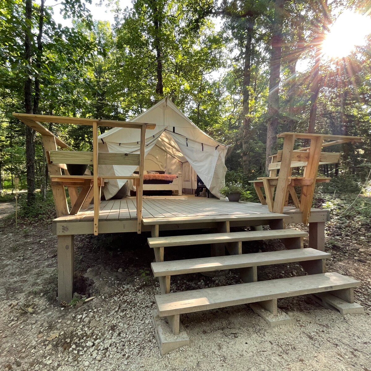 This is a once in a lifetime experience for those who TRULY want to get away from it all. It's rustic, off grid, deep in the Ozarks, yet just minutes away from all the most famous wilderness tourist nature spots. Come enjoy a glamping bell tent... romantic, serene, magical... surrounded by nothing but pine forest where you can relax, listen to birds, take walks on the paths, go dip your feet in a spring fed creek, read a book, lay in a hammock and just unwind from all the madness of society.