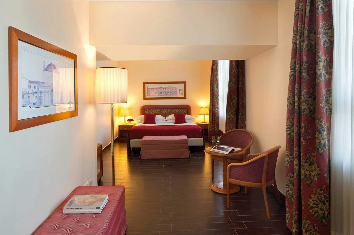 Tento útulný pokoj Max Brown je ideální pro tvůj výlet do města a nabízí pohodlnou postel s manželskou postelí King, pracovní prostor a osvěžující sprchu a dokonce i gramofon. This room gives you all the Max Brown comforts there are. You 'll find a heavenly bed and a tea and coffee maker, AC and a nice bar downstairs, perfect to prepare up for a day of adventures. Najdeš nás poblíž slavného Duomo a obklopeného ikonickými památkami, což z něj dělá ideální základnu pro objevování bohaté historie a kultury města