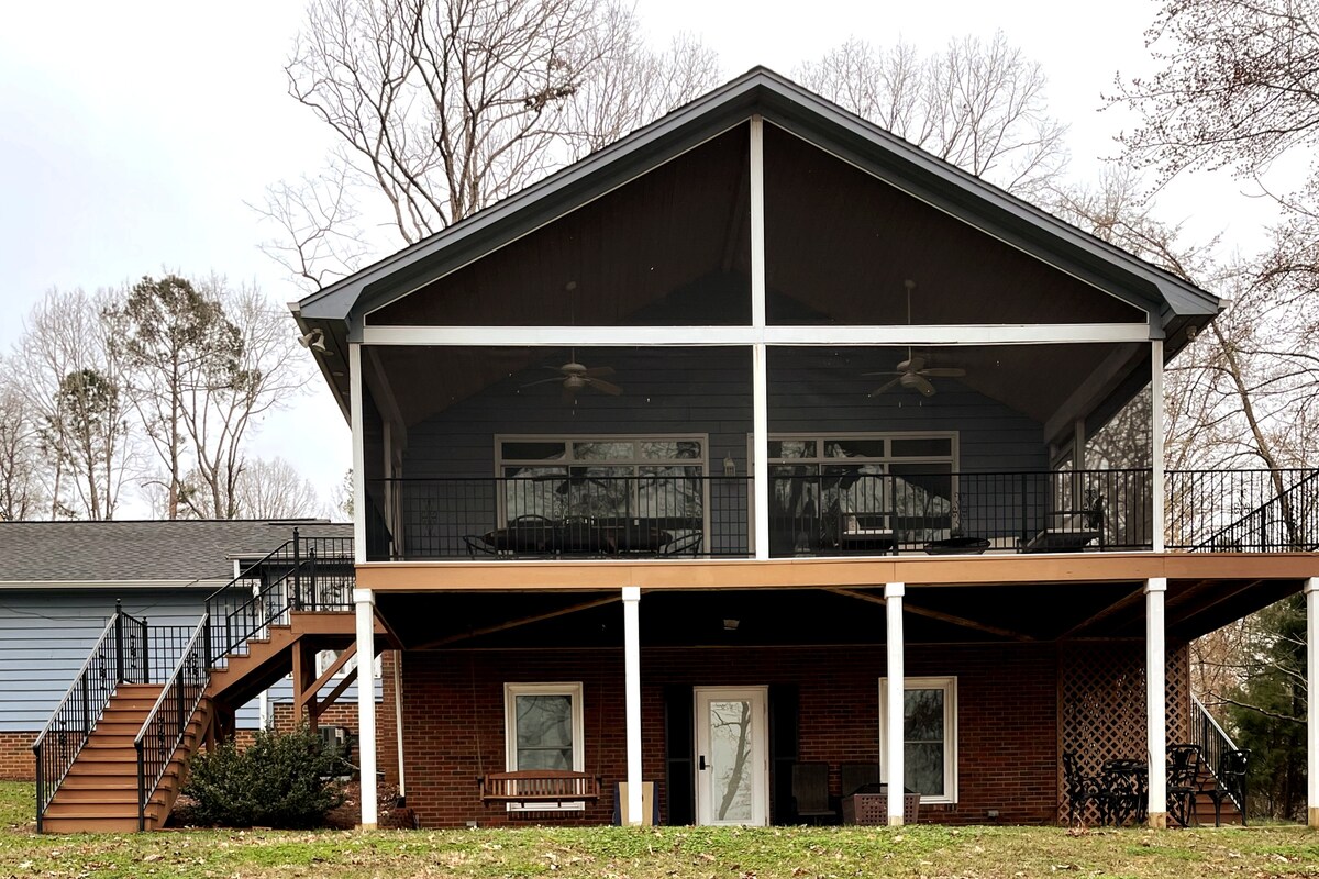 Beautiful 3Br/2BA lakehouse overlooking Badin Lake in gorgeous North Carolina, 1 hour east of Charlotte. Úžasný výhled z 5 pater nad jezerem, s výhledem na Národní les Uwharrie (žádné domy přes jezero). Západ a východ slunce jsou třeba vidět. Schody vedou dolů do přístavu pro rybaření, plavání, relaxaci a jízdu na kajaku. Tři ložnice nabízejí ubytování až pro 10 hostů. Plně zásobená kuchyně, venkovní gril, venkovní ohniště, super rychlá wifi, kabelová televize. Perfektní místo k odpočinku v každém ročním období!