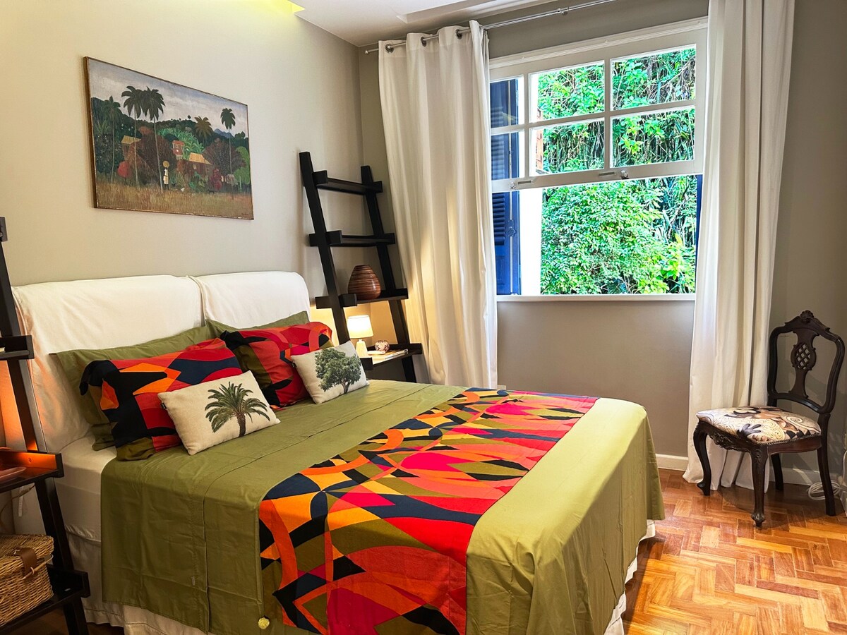 Apartamento reformado, charmoso, luminoso e arejado, bem equipado, localizado em rua arborizada, tranquila, entre a praia e a Lagoa. Ar condicionado em todos os cômodos e ventilador de teto em todo o apartamento. Suíte tranquila com vista para jardim vertical. Internet de 750 megas