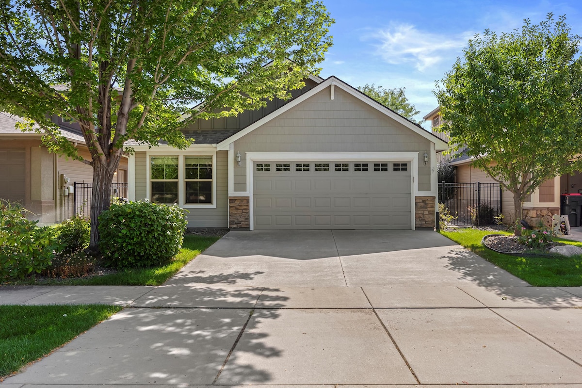 Welcome to your stylish and family-friendly Nampa retreat, near the Nampa Greenbelt and NNU. Perfect for relaxing, exploring, or gathering. This home is within walking distance of the Greenbelt, skatepark & kids park. Features a King Sleep Number bed, a fully stocked kitchen, game options, and a cozy soft-sided hot tub. Enjoy a fenced yard with a firepit, grill, and outdoor space. Just 5 minutes from NNU, Lake Lowell, Deer Flat Wildlife Ranch, and golf—plus easy access to Boise attractions.