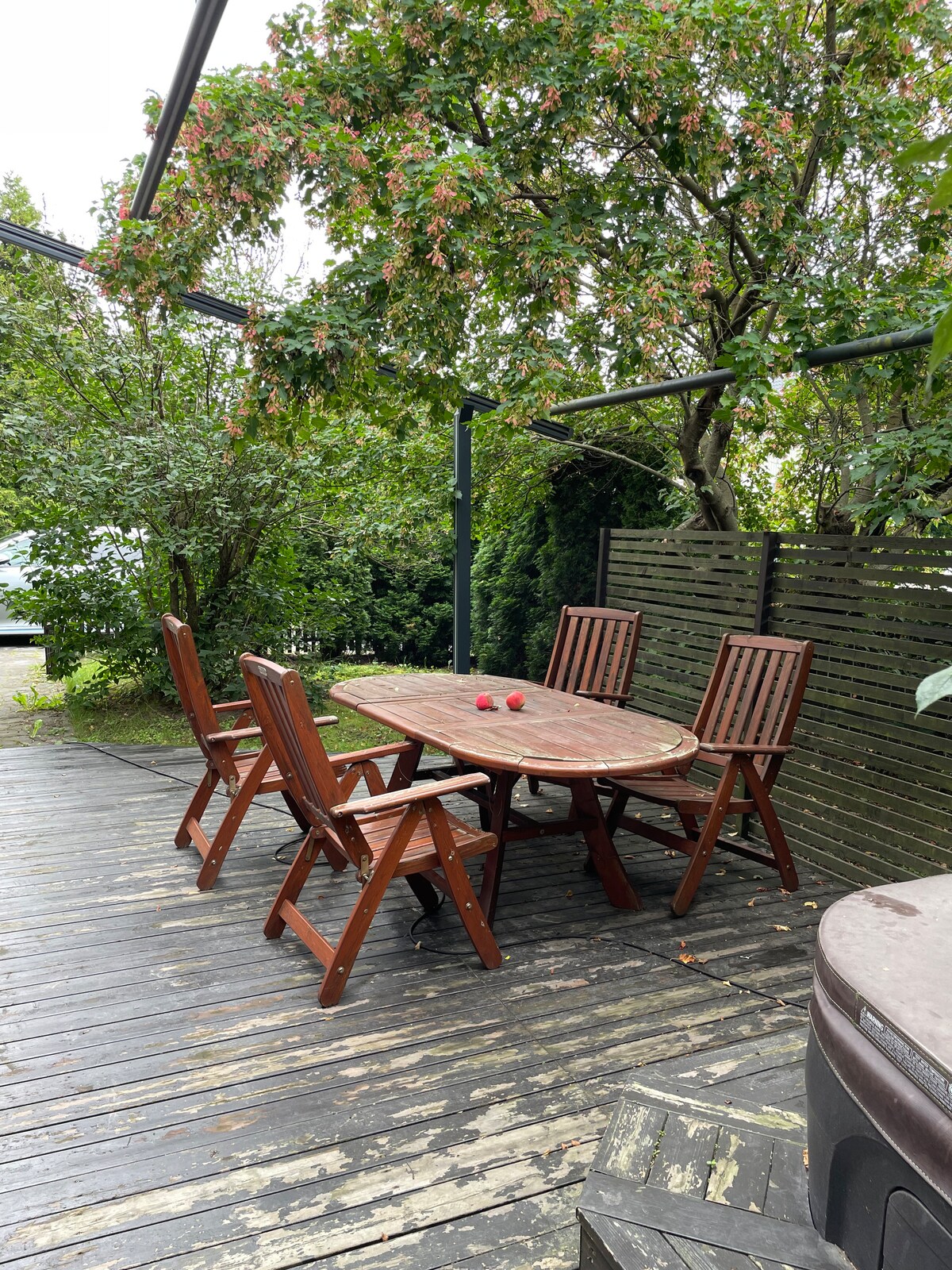 🏡 Spacious house with all amenities 💦 Heated swimming pool Apr–Oct 🌊 Outdoor hot tub available year-round 🛏 Upstairs: 5 bedrooms, landing, home theater, and 2 bathrooms. 🍽 Downstairs: Large, fully equipped kitchen, dining for 18, spacious living room, WC, utility room, and premium sauna with indoor hot tub. 🌳 Outdoors: 2 balconies, large covered terraces, gas grill and outdoor dining. Yard with playground, trampoline, ping pong table, and lawn for relaxing.