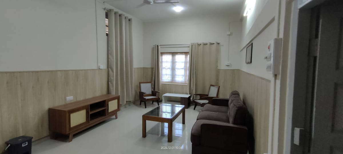 Odpočiň si s rodinou/přáteli v tomto klidném, prostorném, soukromém a bezpečném ubytování. 📞767OOO54OO Jedná se o 2 apartmány BHK v REZIDENCI TAJ s 1 připojenou koupelnou přístupnou z obou ložnic, spolu s balkonem. K dispozici jsou 3 lůžka, šatník, studijní stůl, 6 místný jídelní stůl, pohovka, plynový sporák, lahví, kuchyňské nádobí, hrnce a pánve, filtr, pračka a 4 židle navíc. Má 24 hodin vody a invertor zařízení. Těsně před budovou je také obchod s potravinami.