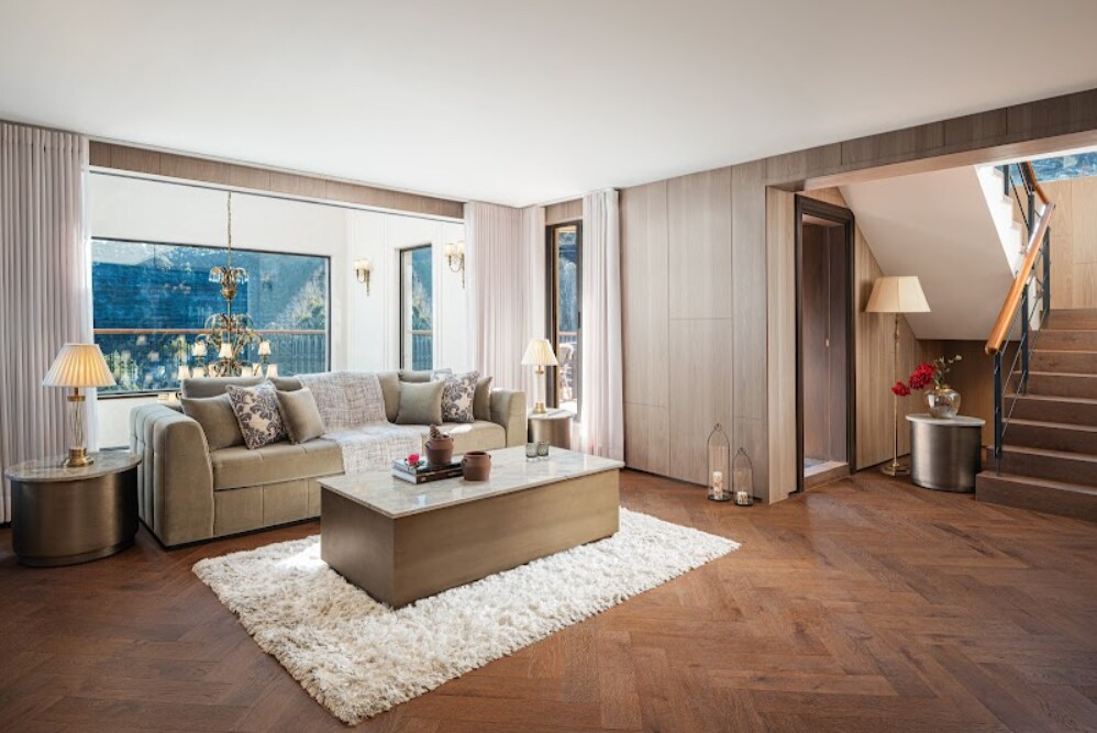 Luxusní podkrovní apartmá je vzdušné a plné světla. Je to útočiště pro cestovatele, kteří hledají intimitu a eleganci. Šikmé dřevěné stropy, vrstvené textury a soukromý balkon s výhledem na údolí lákají k dlouhým ránům, pomalým večerům a klidným úvahám. Každý detail – od pečlivě vybraných dekorací až po měkké horské světlo – vytváří kokon klidu. Tento apartmá, ideální pro páry i jednotlivce, kombinuje sofistikované pohodlí s nadčasovým kouzlem klidných kopců Ramgarhu.