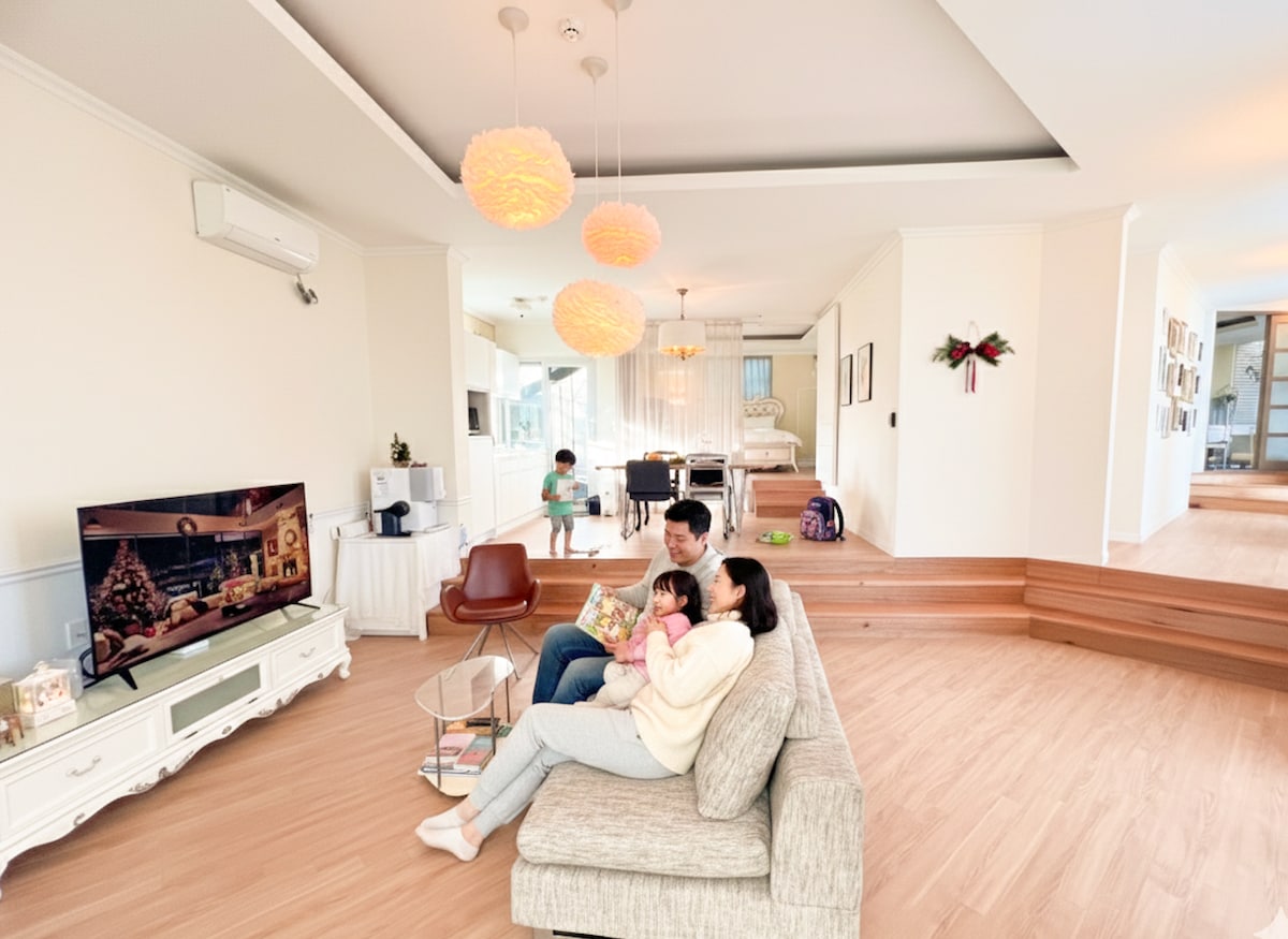 전체 리모델링으로 다시 태어난 독채하우스의 모던함과 푸릇한 자연의 생명이 공존하는 매력을 느껴보세요. Z 구조의 재미있는 단층집은 서로 마주보고있는 거실의 통창으로 시원한 공간감을 느낄수있으며, 야외에는 편안한 휴식을 취할수있는 데크와 파라솔테이블 등 라운지공간이 있습니다. 거실, 키친, 욕실외 3개의 침실로 구성되어 있어 오롯이 1개팀 단독으로 사용할 수 있습니다. 가장 큰 침실에는 퀸침대와 욕실이 방 내부에 있으며, 작은 침실은 싱글침대 2개가 있습니다. 나머지 1개의 침실은 거실과 연결되어 있으나 커튼으로 분리되어 또다른 아늑함을 느낄 수 있습니다. 숙소 운영 시작일부터 세스코계약을 통해 실내외 전반에 걸쳐 항균시스템설치 및 방충 방역관리를 정기적으로 받고있으며, 세콤경비강화로 안전하게 숙소이용을 하는것도 장점입니다. 숙소 내에는 음식물쓰레기처리기, 세탁기, 건조기 등이 비치되어있어 여행기간동안 내집처럼 편리하게 이용하실수 있습니다.