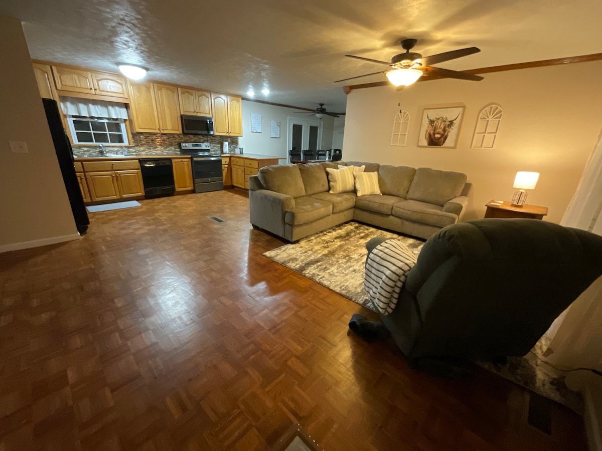 Máme dům o rozloze 2000 čtverečních stop umístěný na 3 akrech v velmi venkovském prostředí. Má 3 ložnice, 2 koupelny, hlavní ložnice má manželskou postel, druhá ložnice má plnohodnotnou postel a třetí ložnice má 2 samostatná lůžka. Velká hlavní koupelna s velkou vanou a sprchovým koutem. Prostorná kuchyně je připravena k vaření, pokud chcete. Zadní veranda s výhledem na lesy a pole se spoustou jelenů. Naše místo je velmi klidné a pokojné. Také je zde garáž, do které máte přístup.