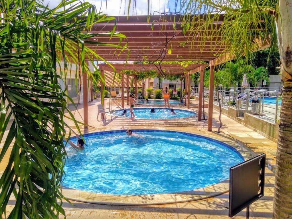 Churrasqueira de carvão no AP; acesso até 23h as 7 piscinas, 3hidros, pode levar bebidas/ comidas nas mesas das piscinas); Sauna; Salão de Jogos; Sala de convivência; Playground; garagem; Ar Condicionado; ventilador, TV 43-Sala; TV 32-Quarto; Wifi; panela elétrica de arroz e feijão; ferro; liquidificador; filtro de água; secador; sanduicheira, Cafeteira; Fogão; Microondas; panelas; utensílios de cozinha. Próximo: supermercado, farmácia, bares, parques, shopping Singapura e feirinha do luar.