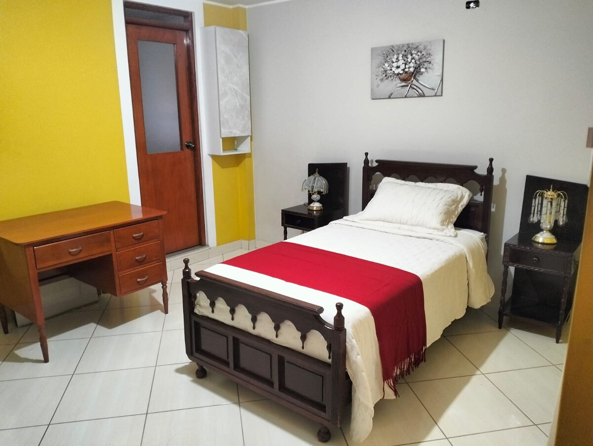 Desconéctese de tus preocupaciones en este espacio tan amplio y sereno. Amplia y encantadora habitación simple para descansar y sentirse como en casa. La propiedad se encuentra a 5 minutos del centro de la cuidad. Cuenta con wifi, baño privado con terma y una zona de trabajo.
