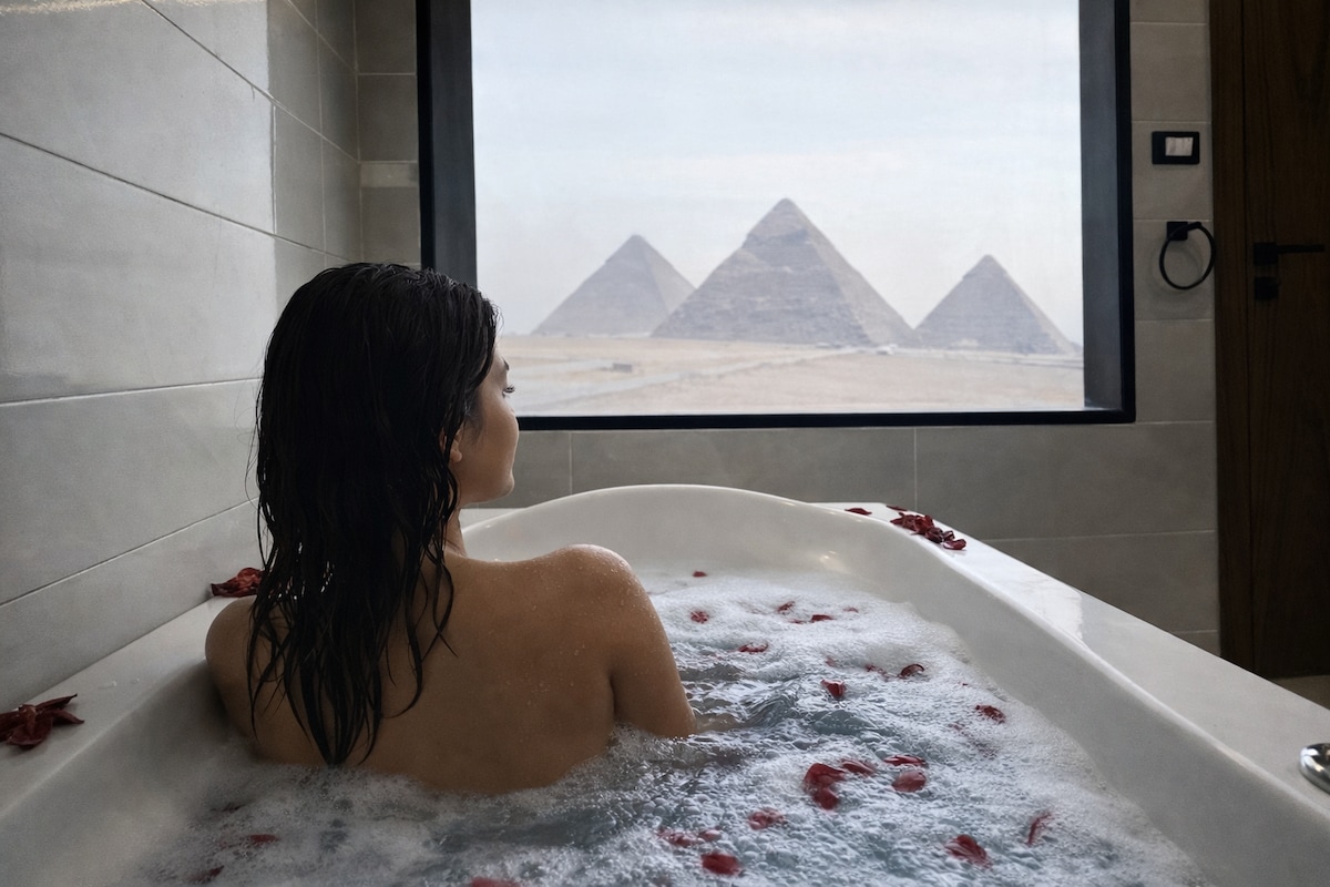 🏛️ Chán pyramid – jedinečný pobyt 🌅 Zažij jedinečný pobyt, kde se ručně vyráběný design snoubí se starověkým zázrakem 🏜️. Tento klidný byt, který se nachází v El Haramu, nabízí přímý výhled na pyramidy z postele 🛏️ nebo vířivky 🛁, takže každé ráno bude opravdu kouzelné. Každý kout je plný zemitých textur 🌿, pečlivě vybraných dekorací 🏺 a přirozeného světla ☀️, které společně vytvářejí prostor navržený pro pomalý život, klidné noci a nezapomenutelná rána.