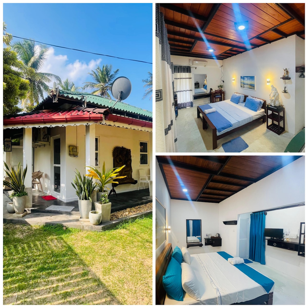 Luxusní vila se 4 krásnými apartmány o rozloze přes 375 metrů čtverečních Nachází se v jižní provincii Srí Lanka, v blízkosti Fort Galle a krásné zlaté písečné pláže King size postel, AC měnič, ventilátor, WiFi zdarma, satelitní TV, minibar Zahrnuje lahodnou kontinentální snídani Krásný výhled na všechny ložnice a obývací pokoj Velký bazén nad 50 'na 27' s vířivkou Velmi velká tropická zahrada Garáž zdarma, prádelna k dispozici. Zaměstnanci hovoří anglicky je k dispozici po celý den