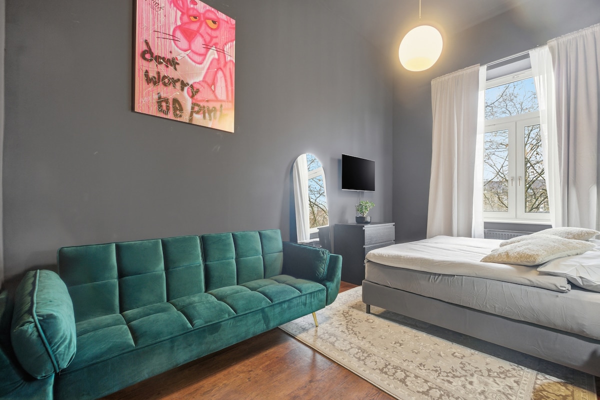 Světlý jednopokojový apartmán 32 m², balkon, Wi-Fi, TV, DVD přehrávač. Kuchyně s dřezem, sporákem, lednicí. Koupelna se sprchou/umyvadlem/WC. Vstupní prostor se šatnou a vestavěnou skříní. Okno/balkonové dveře s roletami a závěsy/žaluziemi. Byt ve 2. patře bytového domu, výtah. Suterén/místnost na kola. Vzdálenost k tramvajové zastávce cca 300 m, 4 zastávky od hlavního nádraží. V blízkosti supermarket, pekárna, prádelna.