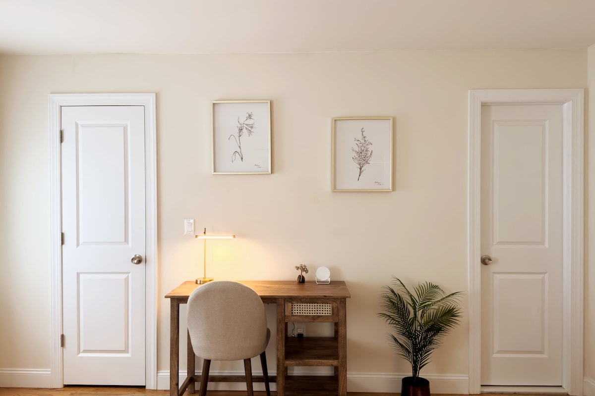 Charming guest house with many designer elements in a park like setting. Drenched with lots of natural light (5 skylights!) and filled with all the things you need! Only minutes from downtown Princeton! This is part of a lovely estate that dates back to the 1700s. We live in the main building and are here to help if you need us! Quiet and serene with an access to the Woodfield Reservation - beautiful trails including ponds. Can be rented with other spaces on the same property. Check my profile!