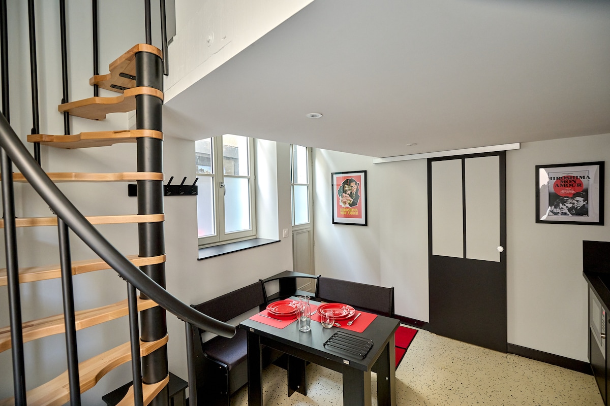 Joli Duplex de 27 m2 entièrement rénové mêlant moderne et ancien. Il bénéficie d'une pièce avec salon, salle à manger et cuisine équipée, d'une salle de bain avec douche, d'une chambre à l'étage et d'une terrasse (vous risquez d'y croiser Suzie notre adorable chien). Vous y trouverez du parquet ancien et un carrelage d'époque. L'appartement est attenant à notre maison. Situé en centre ville dans le quartier Colbert, à 2 minutes à pied de l'hyper centre. Parking gratuit à 1 minute à pied.