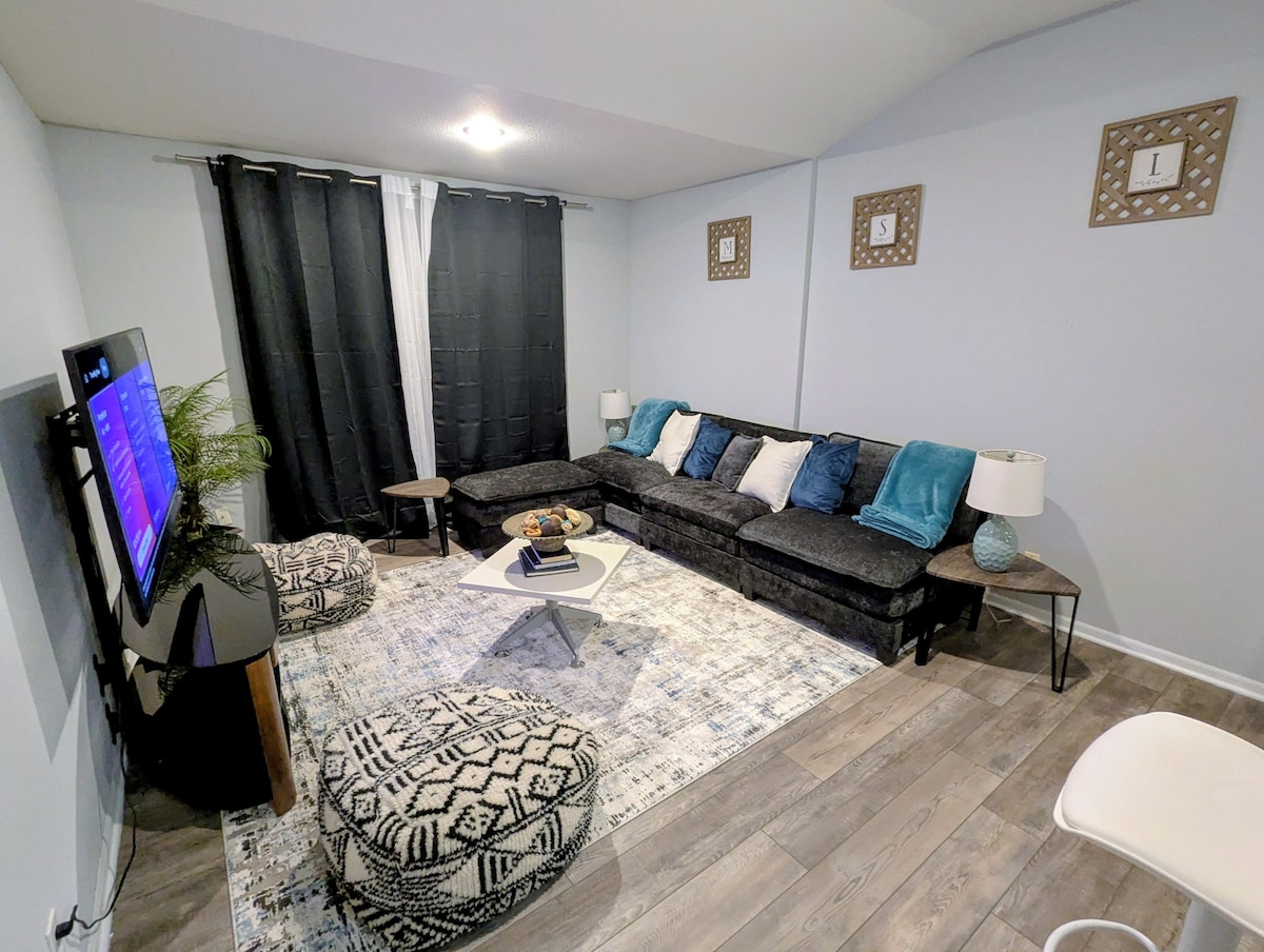 This stylish place to stay is perfect for a small family or individual. AMAZING space - close to Mid America Nazarene University! FULL basement apartment. SEE PICS and REVIEWS. Full kitchen with gas stove, Washer and Dryer, NEW bathroom, and stocked coffee bar included and all needed kitchen items! Refrigerator is stocked w/ pop and juice to start your stay - along with LOTS of snacks to start your stay. Queen bed, 2 fold-away Twin mattresses and 2 cots provides bedding space for up to 6 people.