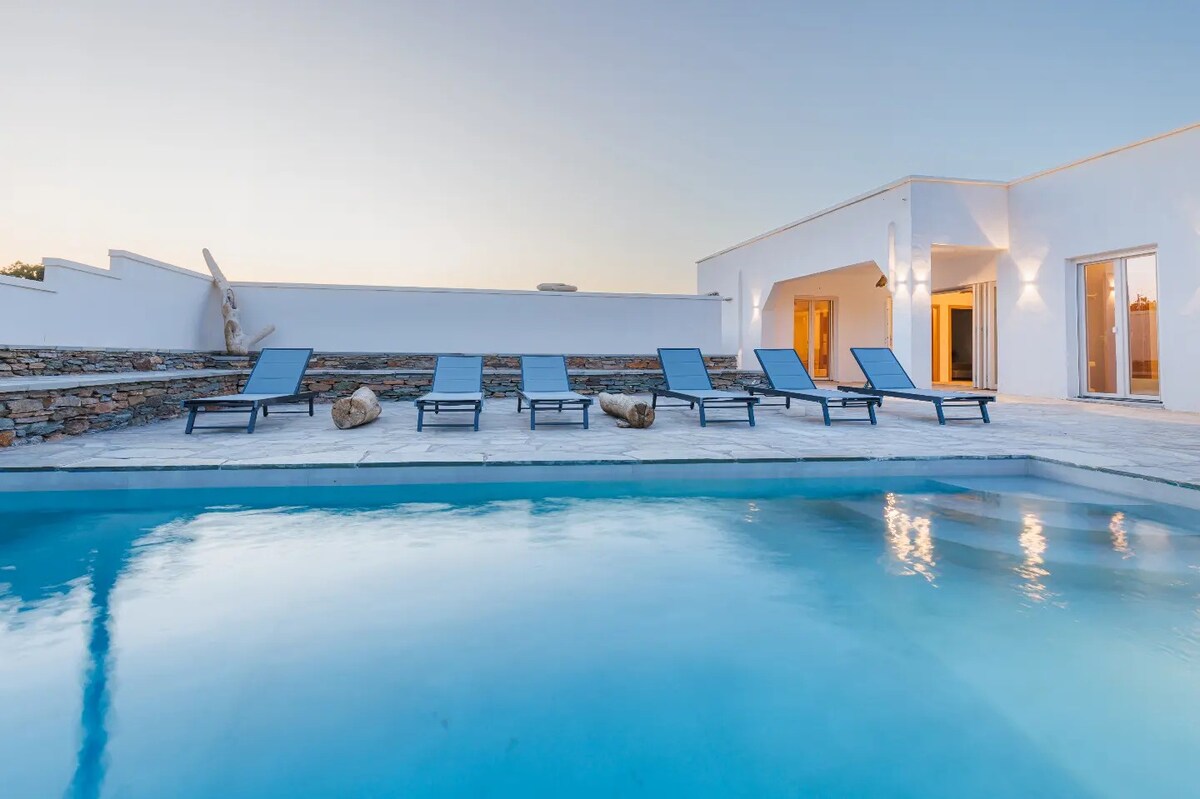 Moderní, plně vybavená vila se soukromým bazénem a jasným výhledem na Egejskou modrou, ti nabídne nezapomenutelné chvíle odpočinku. Prostorné koupaliště je ideálním místem, kde si můžeš vychutnat svůj oblíbený drink a zároveň se kochat nádhernými západy slunce v Kea! Atmosféra je idylická: romantické pláže, třpytivý zlatý písek a jasná modrá obloha ti vyrazí dech. Tato oblast nabízí vše, co potřebuješ pro luxusní nebo poklidnou dovolenou: restaurace, bary, taverny atd. Bezplatná wifi a parkování.