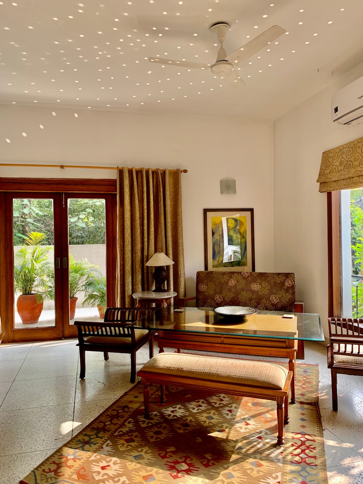 Okouzlující butikový dům se nachází v elitní rezidenční čtvrti v jižním Dillí. Eklektický, jógový a prostorný – zdůrazněný současným indickým uměním, organickými látkami a dobovým nábytkem. V roce 2017 jsme se objevili v časopise „Beautiful Homes“ – „Pečlivě upravené sídlo umělce v Novém Dillí“.