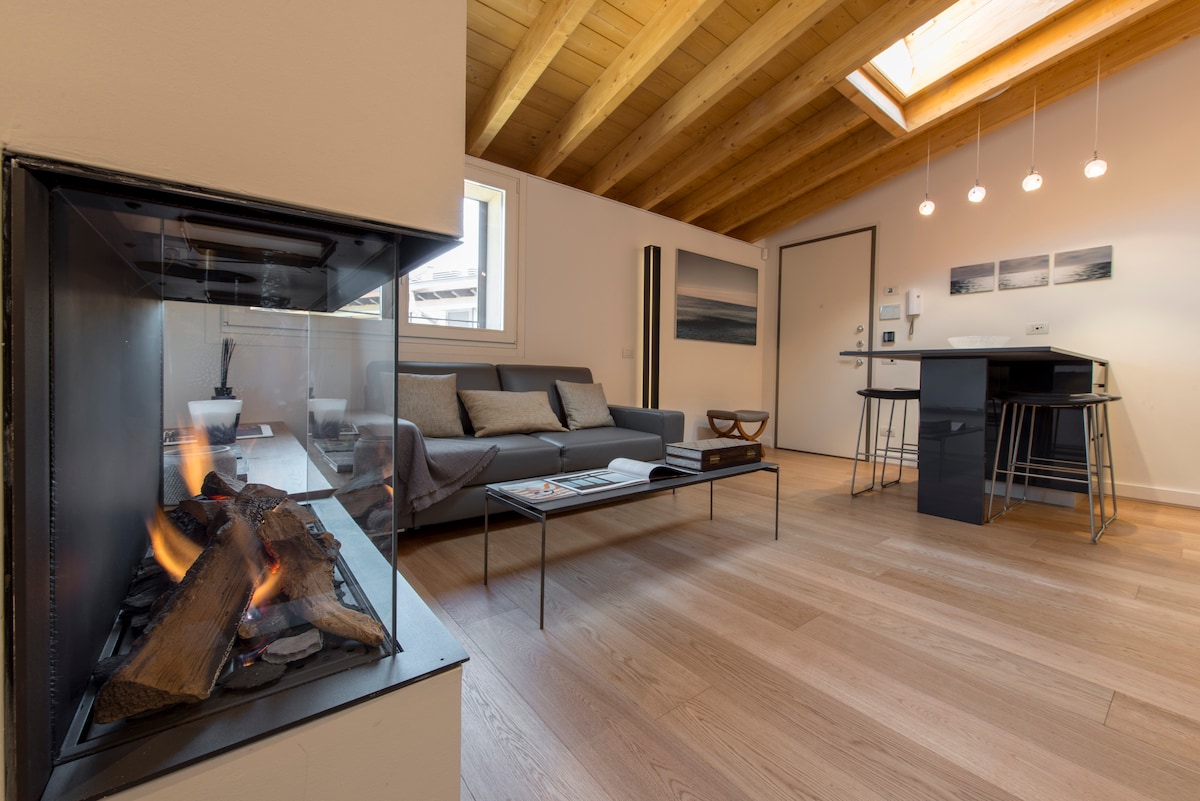 Tichý a stylový design byt v Miláně, podkroví s výtahem a krbem, centrálně umístěný (Isola), plný komfortu, plně zařízený a vybavený, obklopen trendy restaurací, barů a obchodů.