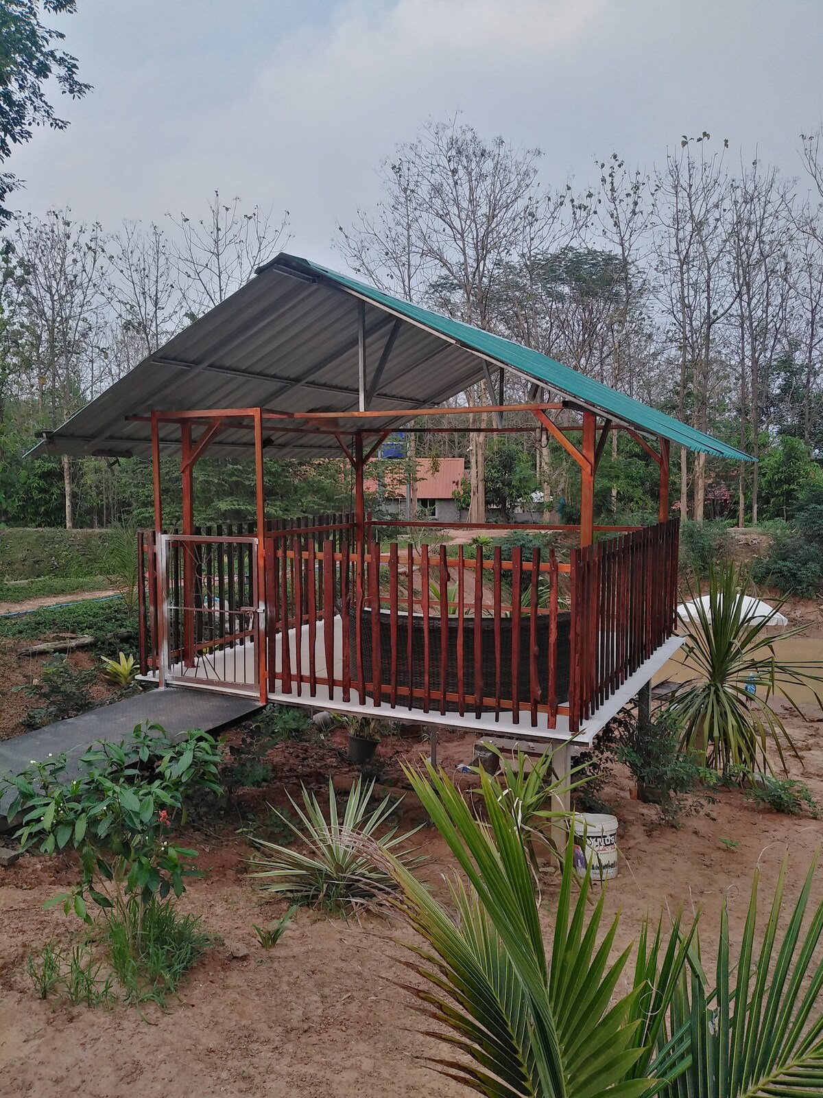 Dvoupatrový dřevěný dům s pavilonem, posezení a relaxační výhled na hory, 2 koupelny, 1 ložnice a 1 kuchyně K dispozici je zásoba vody, elektřiny a internetu. Poloha je hned vedle plotu na příštím letišti. Dál je to jen 2 km Může tvořit kavárny, restaurace, prázdninové domy, klidné, neplavené, výhledy na hory, rýžová pole Pokud nemáš čas se o to postarat, můžu najít někoho, kdo se o tebe postará, jako jsou zahradníci, šéfkuchaři, vařič, pracovníci, hasiči atd.และมีสไตล์