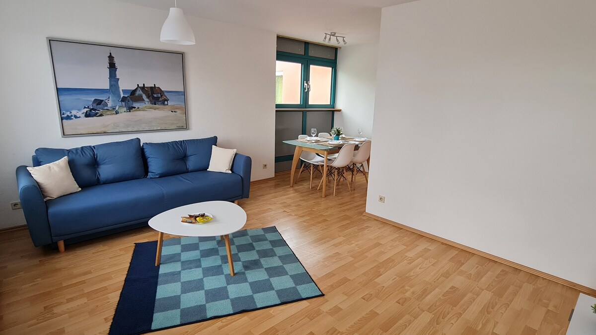 Vollmöblierte Zweiraumwohnung,Nichtraucher, 1.Etage, 62m²,mit zusätzl. großen Balkon mit Tisch,Stühlen,Sonnenschirm+Elektrogrill.Küche ist mit Kühlschrank,Gefrierschrank,Mikrowelle,Wasserkocher, Kaffeemaschine,Toaster,Geschirr,Besteck & einigen Gewürzen ausgestattet. Bad mit Badewanne+Duschvorrichtung,Bademantel,Waschmaschine(ab 1Wo. kostenlos),Fußbodenheizung. Im Wohnzimmer ist SAT-TV, DVD-Player&Sofa mit Bettfunktion.Schlafzimmer mit Doppelbett&großen Kleiderschrank.Fahrradverleih auf Anfrage.