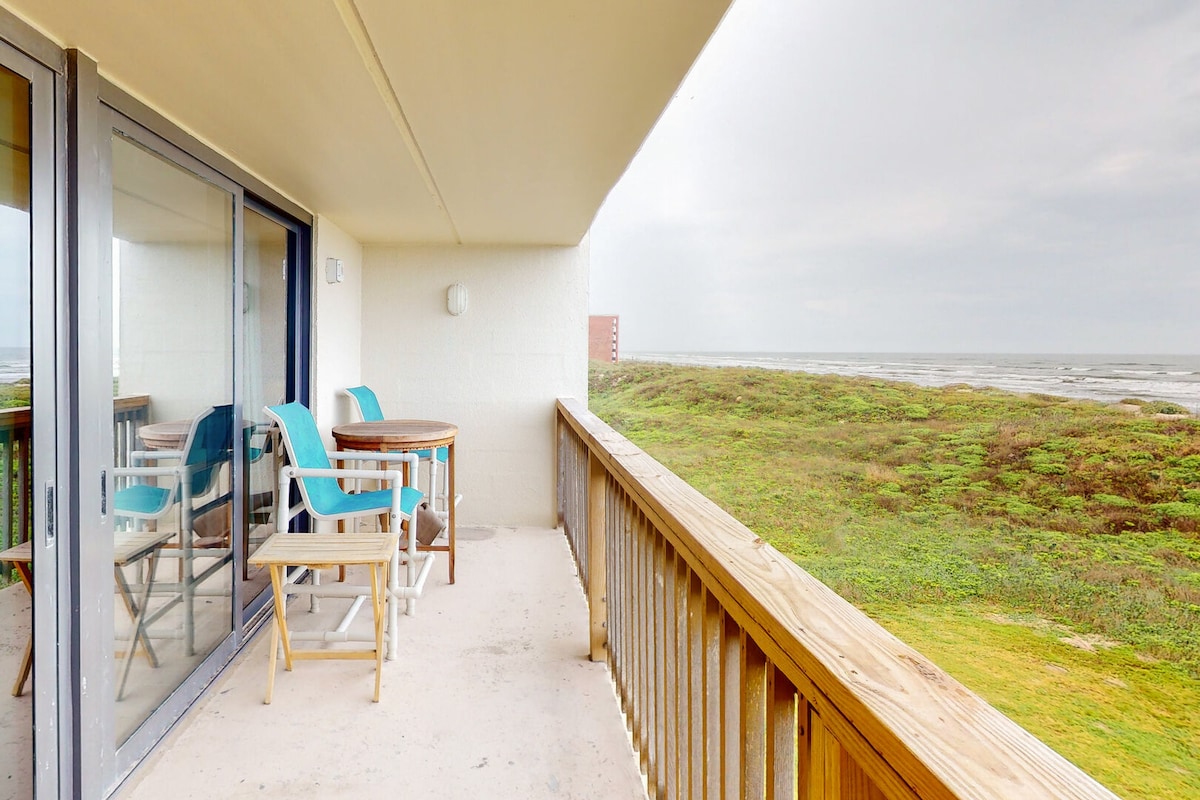 Quiet corner unit w/water and sunset views from large private balcony. 2nd floor unit with no one above. 2 bdrm/1 bath with 2 king beds, 1 queen bed & porta crib. Polosoukromý vchod pouze se 3 dalšími jednotkami. Dobře osvětlené a bezpečné. Parkování v blízkosti. Pouze pár kroků od bazénu a grilovacího altánu. Soukromá promenáda na pláž a nábřeží. V docházkové vzdálenosti od Brewster Street Ice House s živou hudbou. Skvělé místo, kde si můžeš odpočinout, odpočinout si a vytvořit si vzpomínky se svými blízkými. Zimní Texasané vítáni.