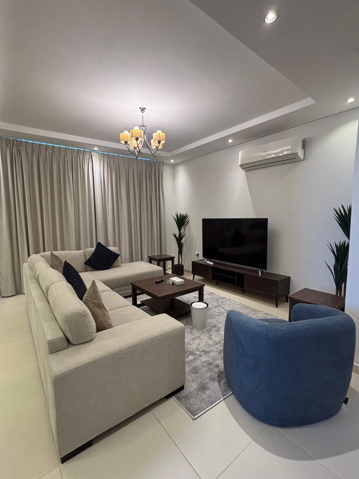 Útulný luxusní apartmán se 2 ložnicemi v Janabiya, ideální pro rodiny. Ideální poloha vedle King Fahad Causeway a v blízkosti Liwanu, s mnoha zařízeními v okolí, včetně restaurací, kaváren, supermarketů a čerpací stanice, nabízející pohodlí, komfort a luxusní životní styl