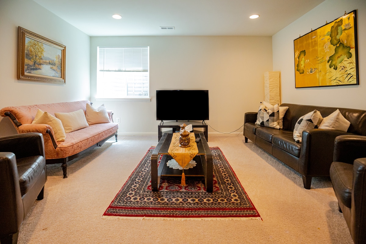 This is a spacious lower level of a newly built home. This private guest area has a lounge, dinning, and kitchenette in addition to a bedroom and a bathroom. Guests share only the main entrance of the townhouse with owners who live upstairs. This private decorated space includes a smart TV, comfortable seating, dining for 4, microwave, coffee maker, full refrigerator, toaster/air fryer, queen bed, wardrobe & dresser. Washer/dryer available upon request. Please review house rules before booking