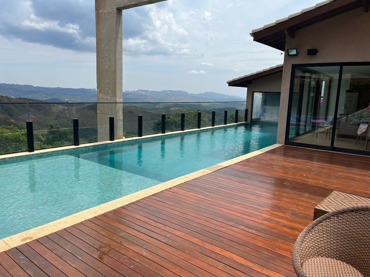 Dům v evropském stylu, kinosál s 75palcovou TV, 6 pokojů, 2 apartmány, jeden s vířivkou a manželskou postelí s elektrickou magnetickou masážní matrací, 3 s balkony, ubytuje až 14 osob. Pozemek o rozloze 12 000 m² s vlastním vyhřívaným bazénem, vyhřívaným SPA pro 9 osob, krbem, gurmánským prostorem s grilem a kamny na dřevo, parní saunou, hřištěm na minigolf a badminton, krásným a vznešeným výhledem na Nova Lima. V blízkosti Alphaville Krásný výhled. Užijte si příjemné klima