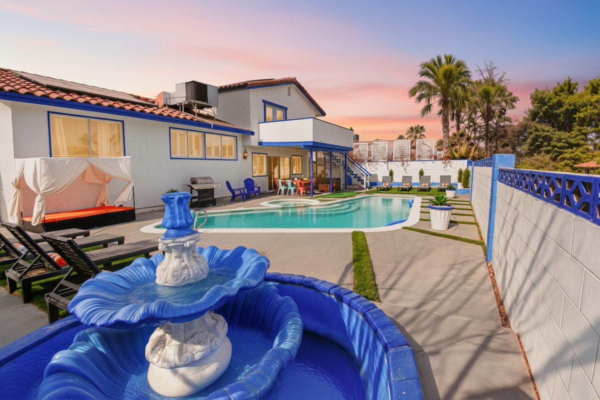 Escape to this luxury 6BR villa near the Strip & airport! Enjoy a Heated Pool & Spa, Fire Pit, BBQ, and a Game Room With Pool Table, Air Hockey, Foosball, Arcade & bar. Unwind in ultra-pro Massage Chairs, stream Netflix & Disney+, or savor coffee from the Nespresso station. The master suite with balcony offers breathtaking mountain views. Free parking for 3 cars, a complimentary bottle of MOËT, and free access to the best pool parties & nightclubs 🥂🔥 Book now before it’s gone