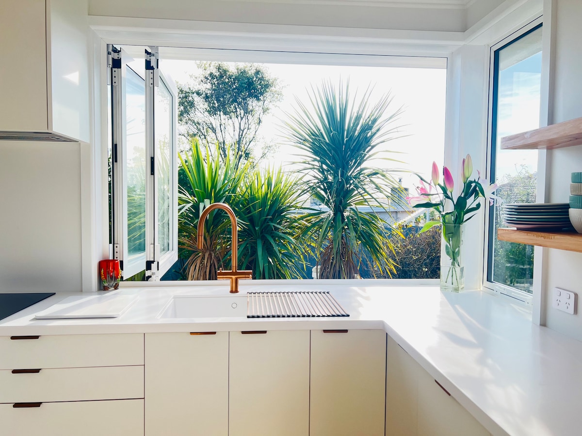 Mezi původními stromy, na slunném jižním kopci, se skrývá klenot z poloviny století. Zahradu doplňuje terasa, která nabízí skvělý výhled na oceán a východ slunce. 2 minuty dolů kopcem do historické čtvrti plné mnoha potěšení, včetně Blue Penguins, pekárny, kavárny, uměleckých galerií a pivovarů. Zlaté písečné pláže východního pobřeží jsou vzdáleny pouhých deset minut jízdy.