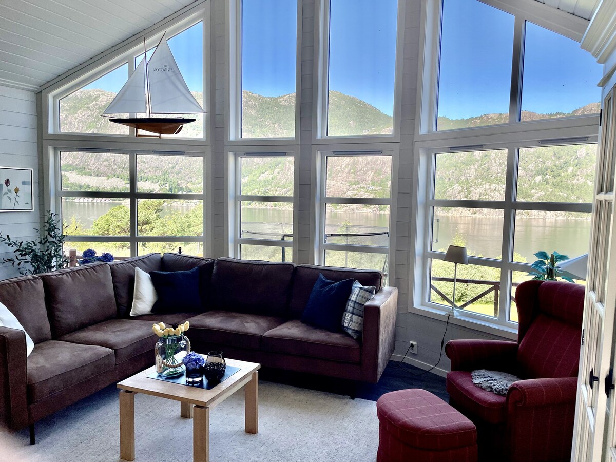 Jedinečná turistická oblast. 15 minut jízdy do výchozího bodu pro výlet do Pulpit Rock a 5 minut jízdy na trajekt do Kjerag. Když vejdeš do dveří, máš pocit, že ti padají ramena a uvidíš úžasný výhled na fjord z velkých oken obývacího pokoje. Povznášející obývací pokoj s kuchyní a vysoko pod střechou. V domě je vše, co potřebuješ k vaření nebo k tomu, aby sis to uvnitř užil/a. V okolí můžeš podniknout krátké i delší pobyty.