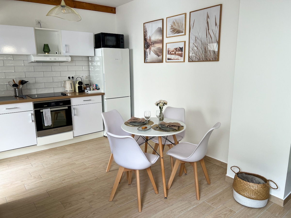 Pěkný světlý garsonka o rozloze 34 m2 v klidné jednosměrné ulici s vybavenou kuchyní (2 indukční varné desky, mikrovlnná trouba, rychlovarná konvice, toustovač a kávovar Dolce Gusto), koupelnou, terasou o rozloze 12 m2 a bezplatným soukromým parkovacím místem. Studio je (autem): - 15 minut od centra Štrasburku - 6 minut od letiště ve Štrasburku Vesnice je obsluhována veřejnou dopravou (viz záložka „Kde se ubytování nachází“ a „Další informace“)