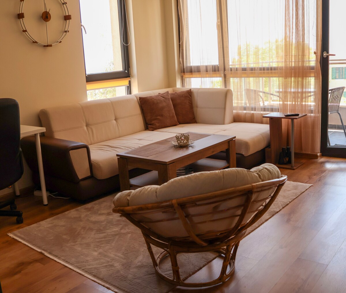 Sea Sunrise & Modern Luxury – Your Coastal Escape Ponoř se do moderní přímořské oázy, kde každý den začíná východem slunce nad mořem a končí uklidňujícím zvukem vln. Tento apartmán se nachází jen pár kroků od pláže Kabakum a mísí útulnost útulné atmosféry, elegantního designu a nádherného výhledu na moře, aby vytvořil dokonalý pobyt. - 300m to Kabakum Beach, 680 m to Resort Sunny day - 26 minut na mezinárodní letiště Varna