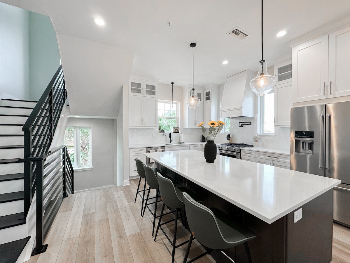 Vítej ve svém stylovém útočišti v Ocalě. Tento moderní prostor v černo-zlatých barvách je navržen pro pohodlí a relaxaci. Užij si útulný elektrický krb, velkou chytrou televizi, elegantní jídelní kout, koupelnu ve stylu lázeňského komplexu a plně zásobený kávový bar, který ti pomůže začít ráno správně. Ať už přijíždíš za prací nebo za volnočasovými aktivitami, tento klidný a promyšleně navržený domov nabízí vše, co potřebuješ k pohodlnému pobytu.