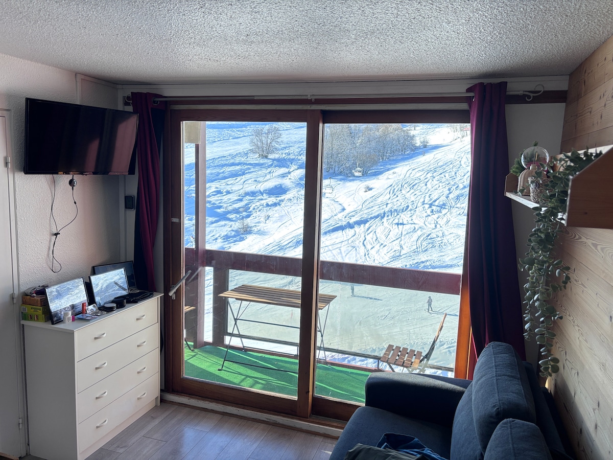 Studio pour 4 au 9e étage de l'immeuble Soyouz-Vanguard Profitez de ce logement au pied des pistes du domaine des Sybelles (Plus de 300km de pistes) avec casier a ski privé, balcon avec superbe vue sur la vallée. Logement équipé de cuisine, 2 lits superposés, canapé convertible, salle de bain, volets roulants électriques et d'espaces de rangements. Accès à tous les commerces, piscine, bars, restos dans la galerie. Idéal pour ski, rando, VTT en famille ou entre amis! Caution ménage demandée.