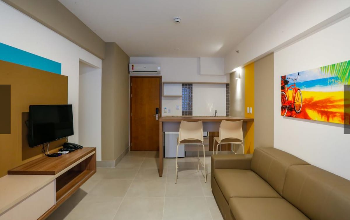 Byt nová strana parku Thermas dos Laranjais Olímpia - SP. Apartmán má velký obývací pokoj s rozkládací pohovkou, americkou kuchyň, koupelnu, ložnici s 1 samostatným lůžkem a pomocnou postelí, plus manželskou postel, koupelnu s plynovou sprchou, vysoušečem vlasů, ručníky, Wifi, klimatizací, krytým parkováním a snadným přístupem do parku. *Jakmile bude rezervace dokončena zde na platformě, budeš požádán/a o podrobnosti všech hostů, kteří musí být poskytnuty v co nejkratším čase.*