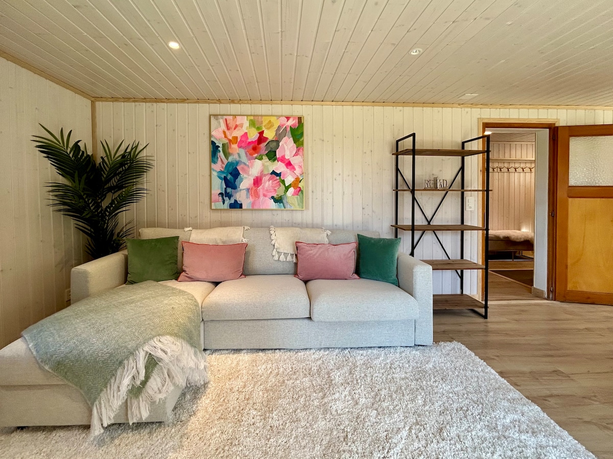 L'appartement fait partie de l'annexe érigée en 1950 au chalet paternel. Ce chalet a été construit en 1850 par mon arrière-grand-père, mes grands-parents y ont vécus et mon papa et sa soeur y sont nés. L'appartement a été rénové de peu, il est meublé simplement et fonctionnellement. Devant le chalet, il y a un terrain gazonné, qui a été longtemps le potager et la seule source de revenu pour ma grand-maman devenue veuve prématurément.