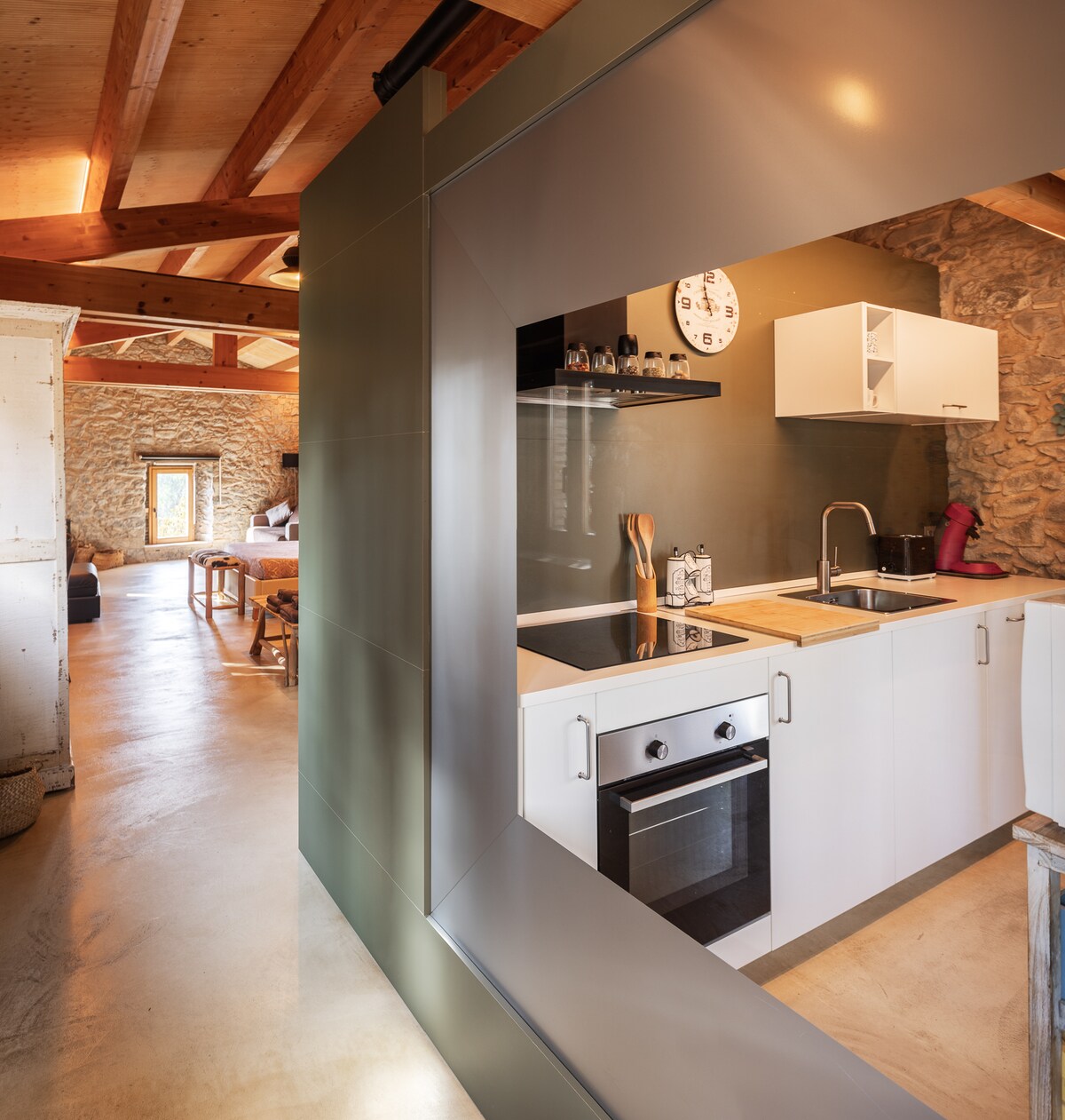 Stodola má obývací pokoj s černou kuchyní, pokoj s manželskou postelí, podkroví se dvěma lůžky a rozkládací pohovkou v obývacím pokoji. Má také dvojitou sprchu s oknem, abyste mohli při sprchování obdivovat přírodu. Krb, bazén a řeka. A okolí s monumentálním komplexem tvořeným románským kostelem s kryptou, modernistickým hřbitovem a iberiánskou vesnicí 5 minut odtud. Velkolepé! 5 minut od venkovské restaurace a 10 minut od vesnice/města.