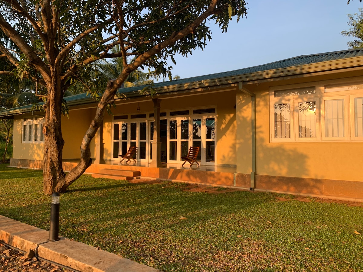 Odpočiň si v naší soukromé vile, která se nachází v klidné kokosové plantáži poblíž lesa Badagamuwa. Nachází se pouhých 6 km od města Kurunegala a 1 km od silnice Dambulla, takže je ideální pro rodiny a přátele. Je to také skvělý výchozí bod pro průzkum centrální Srí Lanky: jeskynní chrám Dambulla asi 50 minut, Lví skála Sigiriya asi 1 hodinu 15 minut a Kandy asi 60 minut jízdy. Ideální pro klidný víkend nebo osvěžující zastávku na cestě do Dambully/Anuradhapury