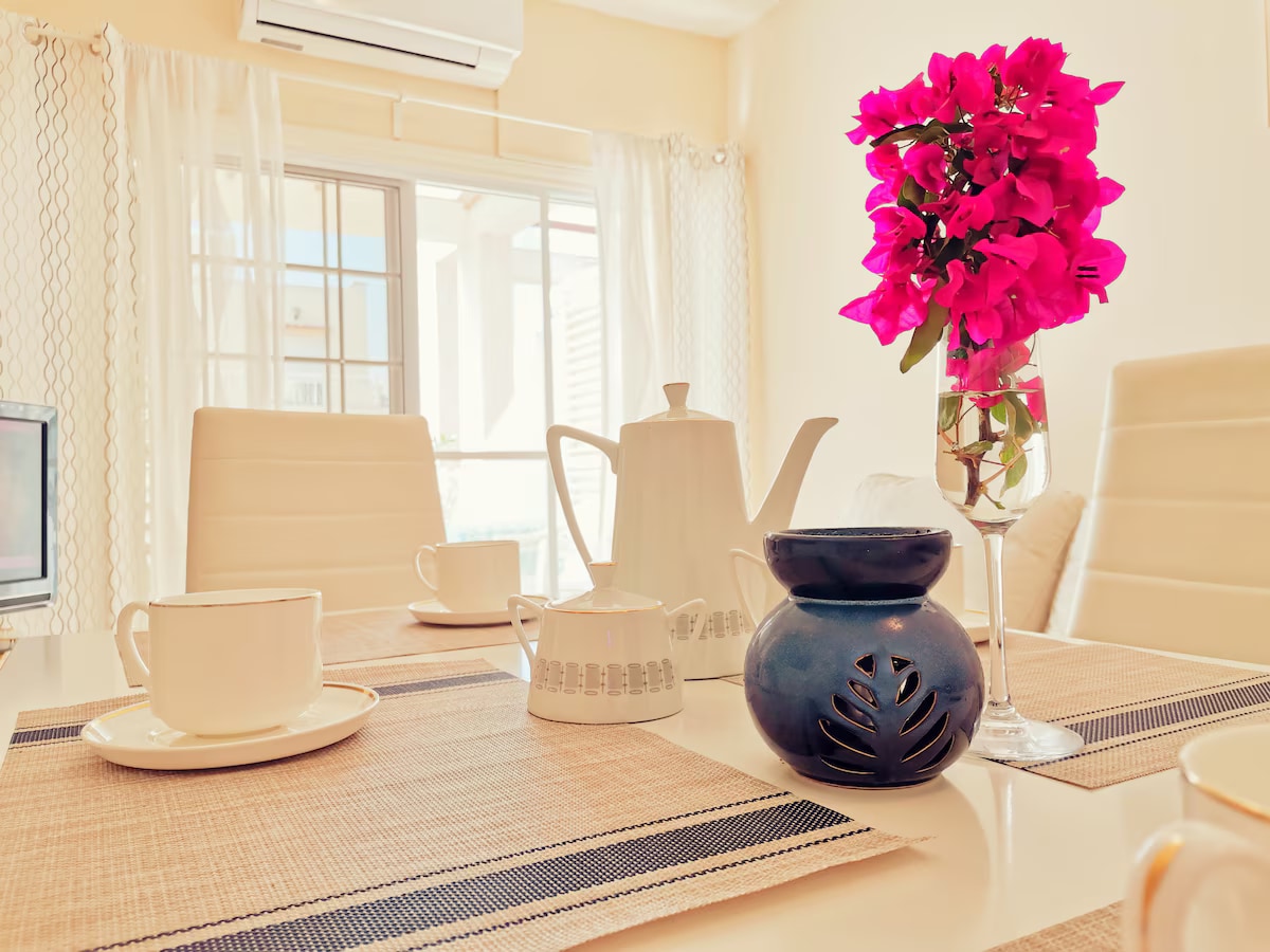 Náš apartmán má dvě ložnice, dvě koupelny, velký otevřený obývací pokoj, plně vybavenou kuchyň a balkón. Byt má soukromé kryté parkoviště. Můžete využívat společný bazén, k dispozici jsou také lehátka a slunečníky. K dispozici je také bezplatné Wi-Fi a chytrá televize, kde se můžete připojit ke svému účtu Netflix. Byt je plně klimatizován. Je to nejlepší místo pro rodiny nebo páry. Nachází se 20 minut jízdy od letiště a 3 km od pláže.