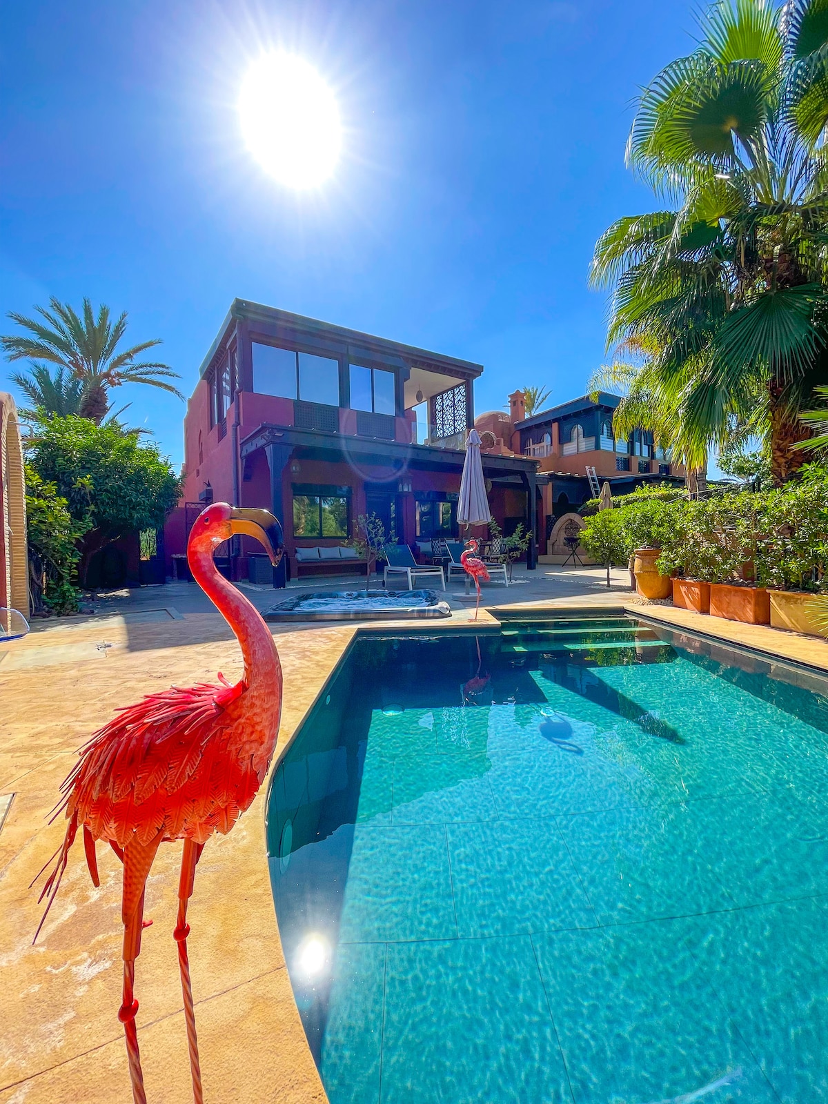 Vila se nachází 30 minut od Guelizu v okouzlujícím zabezpečeném areálu s komunitním tenisovým kurtem a soukromým bazénem. Vila se skládá ze 3 velmi velkých apartmánů, z nichž každý má vlastní krb, televizi (Netflix zdarma), 3 koupelny, malý vyhřívaný vnitřní bazén, soukromý venkovní bazén a soukromou zahradu, kterou není vidět, obývací pokoj s krbem. Jídelní stůl, který lze přeměnit na kulečníkový a pingpongový stůl. Ideální pro klidnou relaxaci.