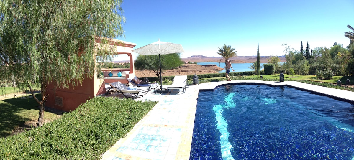 Vila se nachází v blízkosti Ouarzazate, výjimečný výhled na jezero a Atlas často zasněžené.. Oceníte místo pro nádheru domu ( 540 m2) a jeho zahradu ( 4000 m2), jeho pohodlí, klid míst, blízkost jezera a Atlas, přivítání Jalil, kuchyně Hafida a služby Fatima.. Ideální pro páry, obchodní cestující, rodiny (s dětmi), velké skupiny a čtyřnohé společníky.