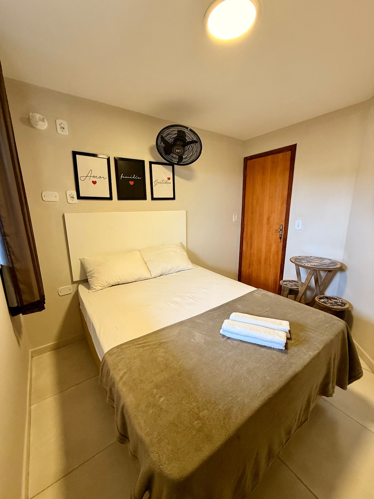 Větraný dům s ložnicí se 2 manželskými postelemi, koupelnou, gurmánským koutem s grilem, sporákem, lednicí, dřezem, rozkládací pohovkou, filtrem a porcelánovou podlahou. K dispozici je také strom acerola, parkovací místo pro auta, venkovní osvětlení v noci, prostor pro volný čas v zadní části. K dispozici je také příbory, talíře a sklenice. V ubytování najdete mýdlo, ručníky, ložní prádlo, čisticí prostředky a ventilátor. Dvorek v uzavřeném kondominiu s 24hodinovou ostrahou. V kondominiu je dětský park.