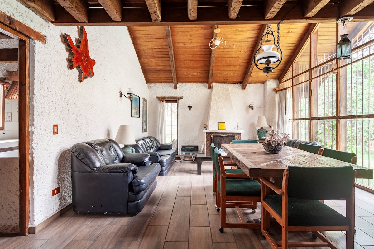 Relájate en este lindo Chalet estilo suizo, ideal para desconectarte, rodeado de árboles y naturaleza. Cuenta con cocina equipada, chimenea (incluye carga de leña), wifi y sala de lectura. Pet friendly, con gran jardín, tranquilo y muy seguro. Caminando encontrarás tiendas, farmacia, restaurantes, iglesia y taxis. Muy lindo para pasear, podrás rentar cuatrimotos y montar a caballo.