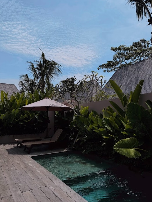 Brand New Designer Villa in Tranquil South Bali • Stylish air-conditioned bedroom with lush tropical views • En-suite bathroom with modern fittings • Large swimming pool surrounded by greenery — perfect for sunbathing or BBQs • Bright open-plan living room & fully equipped modern kitchen • 300 Mbps Wi-Fi for work & streaming • Daily cleaning with fresh towels & linens • Netflix & PS5, baby amenities & BBQ grill on request • Concierge service for airport transfer, scooter rental & more
